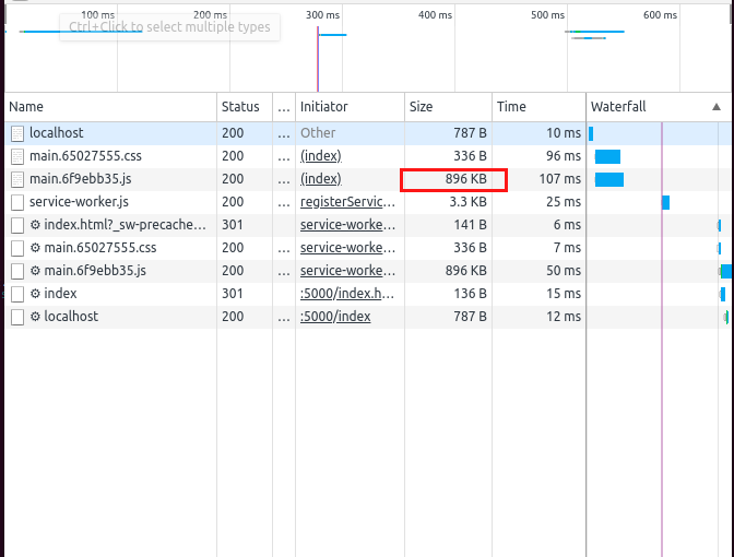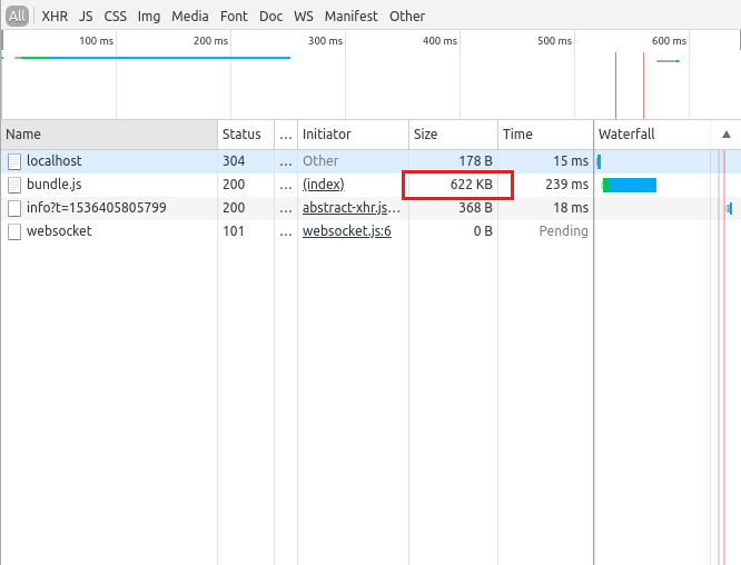 hasil testnya dibrowser (Development Mode) antara test case sebelumnya dari ukuran 1.3MB menjadi 622KB.